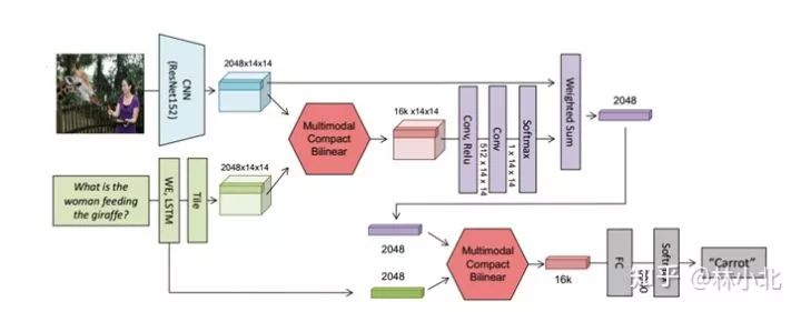 这个结构相当容易理解,就是一共用到了两次MCBP模块,第一个MCBP融合了文本和图像的特征进而用来提取图像的attention,第二个MCBP则把图像的attention特征与文本特征再一次融合,最终结果送入softmax分类器得到答案。