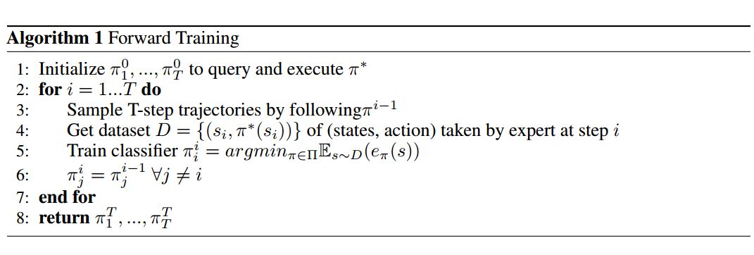 前馈训练算法是 2012 年由 Ross 和 Bagnell 提出,它在每个时间步 t(t 属于全部时间步 T)上训练一种策略 π_t。即在每个 t 上,选择机器学习策略 π_t 以模仿专家策略 π*。这种迭代性训练在以下算法 1 中有详细描述: