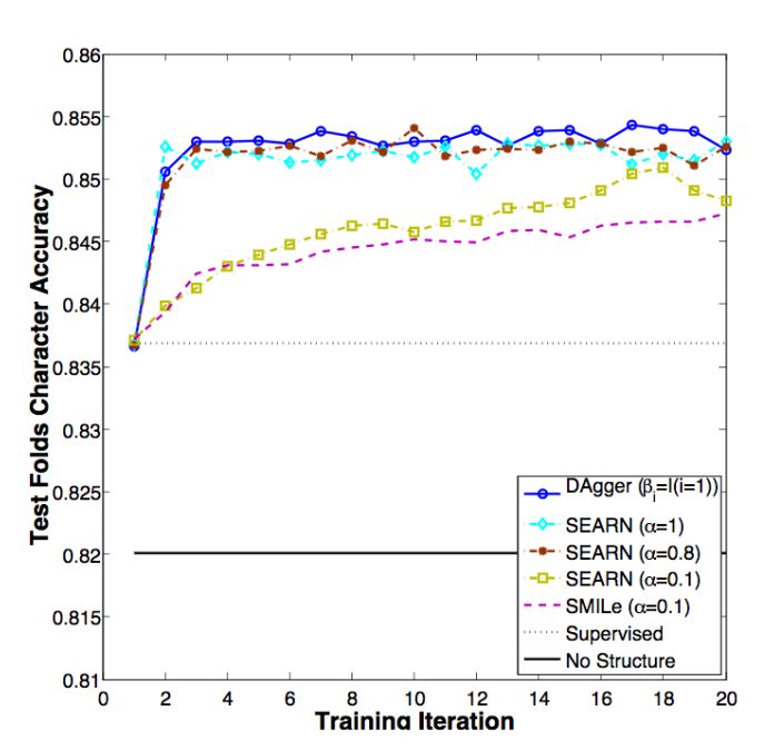 图 3:在手写字符识别任务上的 DAgger、SMILe、SEARN 和监督式方法的表现比较。基准只是一个独立预测每个字符的支持向量机(SVM)。α=1(相当于纯策略迭代方法)和 α=0.8 的 SEARN 和 DAgger 在这一任务上表现更好(来自 DAgger 原论文 [5])。