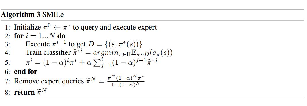 具体而言,我们从一个完全遵循专家行动的策略π_0 开始。在每次迭代中,我们训练一个策略π_i 以在以前的策略π_i-1 诱导的轨迹下模仿专家。接着,我们将新的训练策略添加到先前的几何折扣因子α(1 − α)^(i−1) 的策略混合中。因此,新的策略π_i 是 i 策略的混合,其中使用专家行动的概率为 (1 − α)^ i。算法 3 描述了 SMILe 算法。