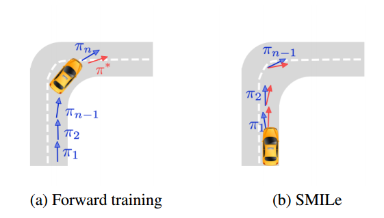 图 1:前馈训练和 SMILe 算法在自动驾驶汽车上的对比
