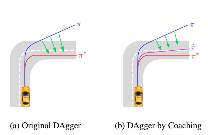使用 DAgger 时,策略空间可能与学习策略空间相距甚远,这会限制学习能力,也可能无法根据状态推断得到信息。为了防止出现这种情况,HHH Daumé III 等人在 2012 年提出了 DAgger by coaching 算法 [6]。使用这一算法,我们可以执行易于学习的动作,即在学习器的学习能力范围内。当动作太难时,教练(coach)会降低目标然后渐进地教授。