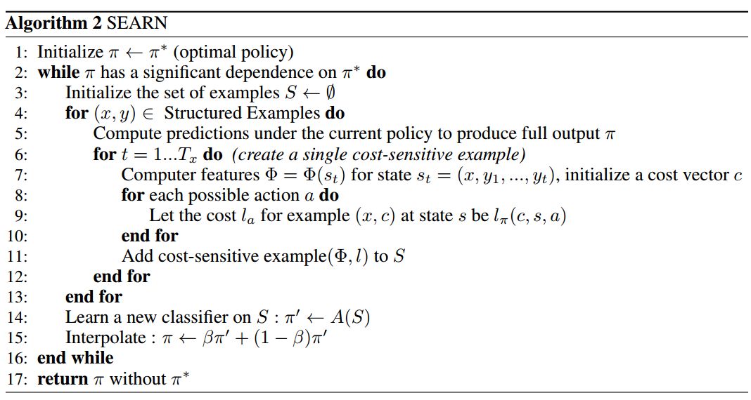 SEARN 的想法来自 Daumé III et al. (2009) [3],其并没有学习一些全局模型与搜索(一般模型的标准设置),而是简单地学习一个分类器以最优地搜索每一个决策。算法通过在每一步上遵循专家行动开始,迭代地收集示范并利用它们训练新策略。根据之前所有训练策略以及专家行动的混合,它通过采取行动编译了新的 episodes。最后,它慢慢地学习遵循混合策略并停止依赖专家以决定其要采取的行动。