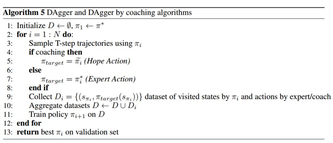 算法 5 描述了 DAgger 算法和 DAgger by coaching 算法。