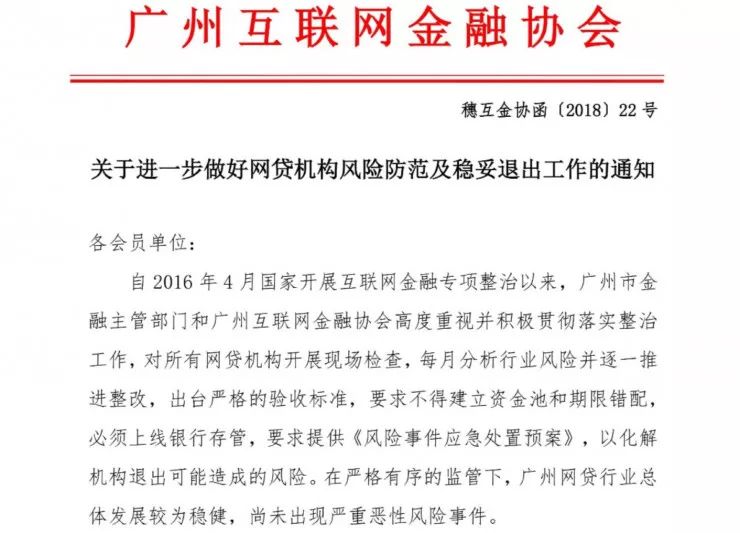 雷锋网AI金融评论消息,今日上午,广州互金协会官网发布《关于进一步做好网贷机构风险防范及稳妥退出工作的通知》。该协会指出,近期,全国范围内出现多起网贷机构“爆雷”、“跑路”等事件,严重损害出借人、借款人合法权益,影响社会秩序与稳定。