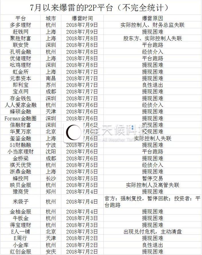 雷锋网AI金融评论了解到,6月至今,已有百余家P2P平台爆雷。全天候科技报道称,其中,7月份共有四家交易规模上百亿级别的P2P平台停业,包括钱爸爸(累计交易金额300亿元)、牛板金(累计交易金额390亿)、银票网(累计交易金额140亿元)、投融家(累计交易金额103亿元)。