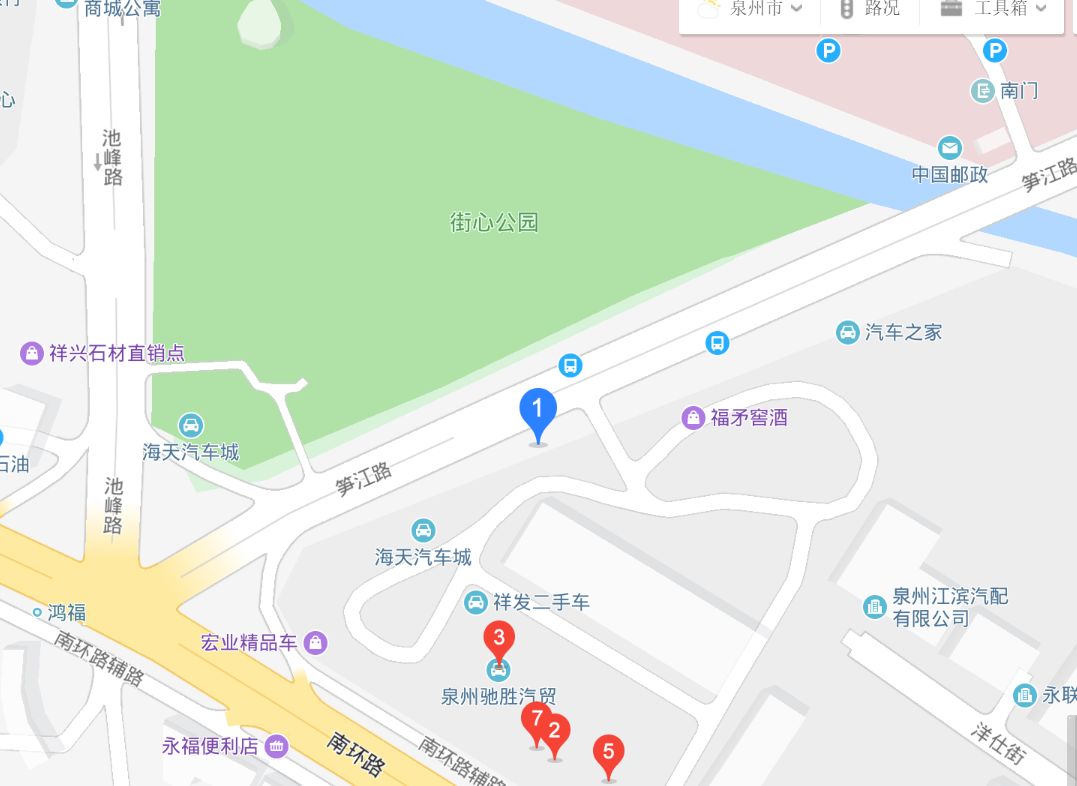 这是百度的一个结果,排在第一个是长沙的。我们查看一下实景地图中长沙河西蓝天汽车城的相关景貌。