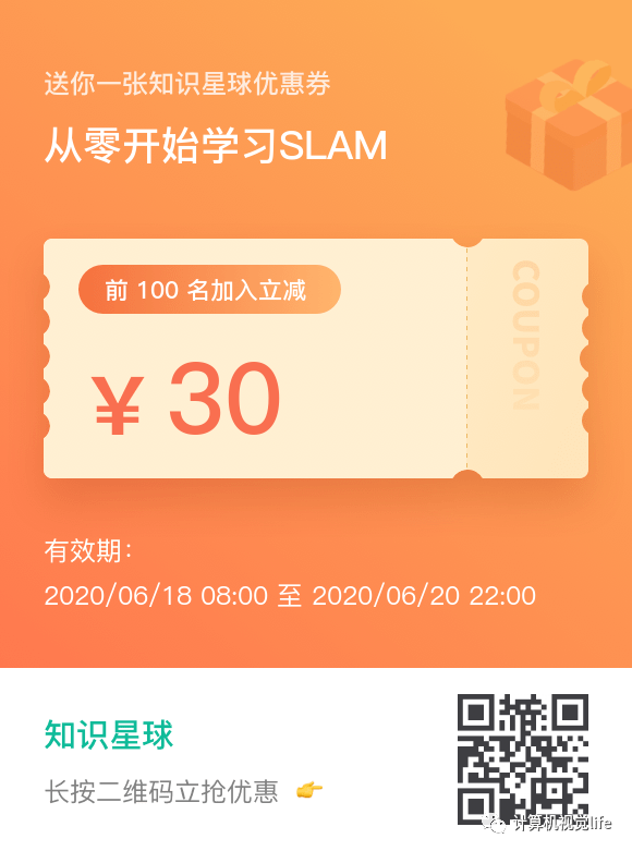 时间无价,万事早为先。学习切忌单打独斗,一个良好的学习圈子能够帮助你快速入门,交流讨论才能少走弯路,快速进步!加入SLAM学习星球,和国内外优秀的SLAM研究者一起交流进步,早日找到理想工作。3天内无条件退款。已经有1350+小伙伴加入,等你来哦