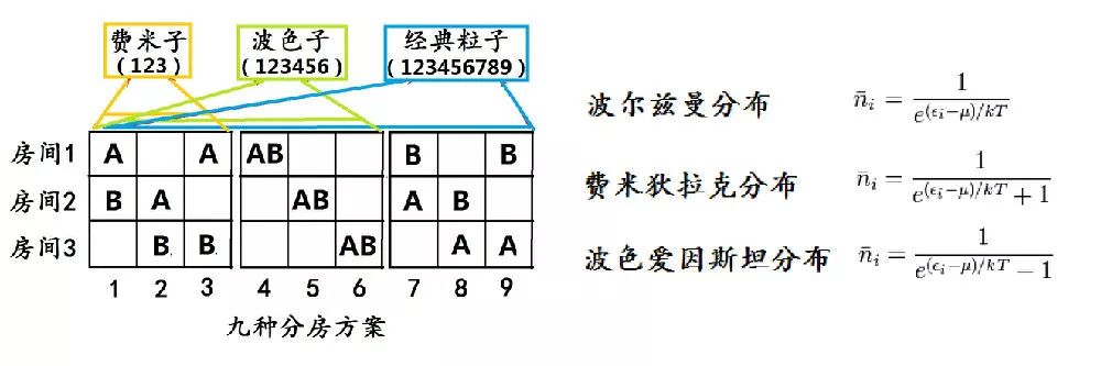 这3种粒子本性的不同,又如何影响它们的统计分配规律呢?让我们从一个简单的例子:两个粒子(A、B)分住三间房子(F1、F2、F3)的情况,来体会这点。