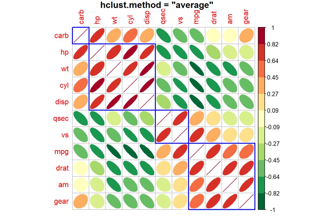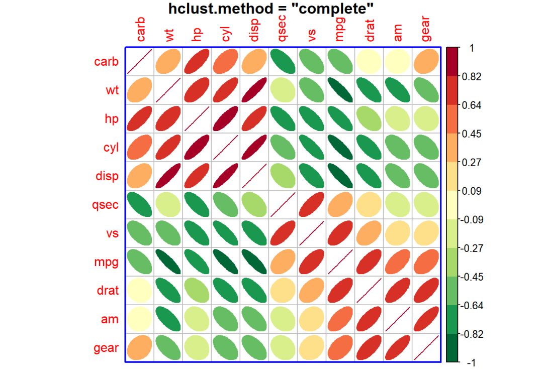 1corrplot(mat_cor, method = "ellipse", order = "hclust",  col = palette_2,