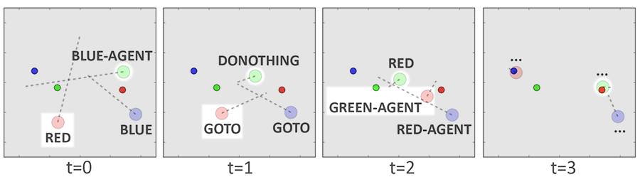 在时间步发展中,t=0 时红色智能体对其他智能体说了一个单词以表示红色界标(图中深红色),随后在t=1 时又说了相当于「去(Goto)」的单词,在 t=2 时它说:「绿色智能体」。绿色智能体听到了这些指令,立即移动到了红色界标的位置。
