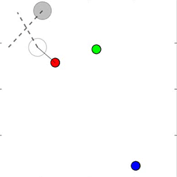 当智能体不能通过文本相互交流,并且必须在模拟环境中执行物理运动时,该训练法同样能运作。在接下来的动图中,研究员们展示了智能体指向点的即时情况或指导其他智能体去目标的情况,在极端情况下智能体会看不见它们的目标。