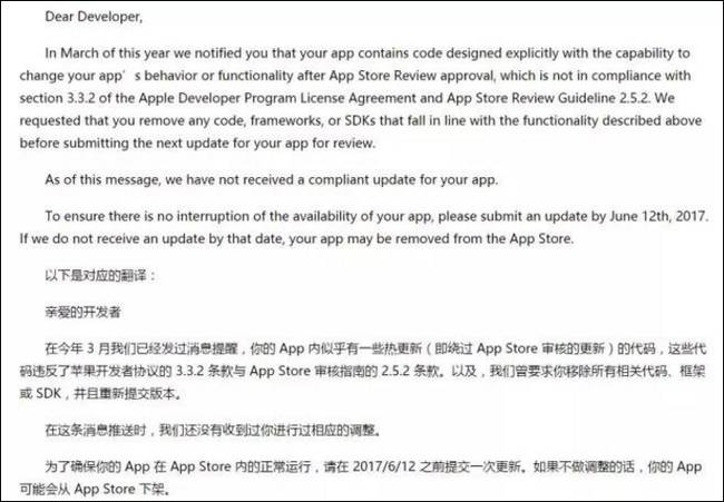 近日,不少app开发者收到了苹果公司的禁止热更新警告