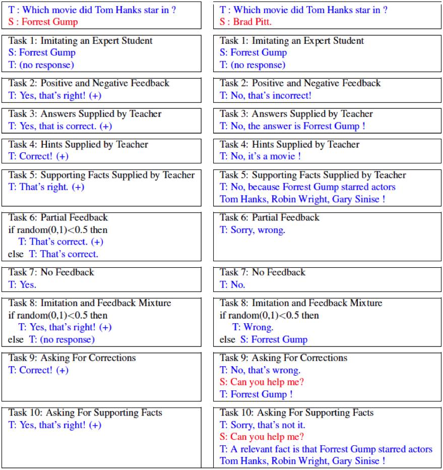图 8.1:我们的模拟器实现的 10 个任务,其中评估了不同类型的应答和互反的反馈。每一个案例中给定 WikiMovies 中的例子,其中左侧学生(机器)全部回答正确,而右侧学生全部回答错误。学生的应答用红色文本表示,学生用 S 表示,教师的反馈用蓝色文本表示,而教师用 T 表示。为了模仿学习过程,教师需要提供学生(以 S 表示)在任务 1 和 8 中做出的应答。(+)表示一次正面奖励。