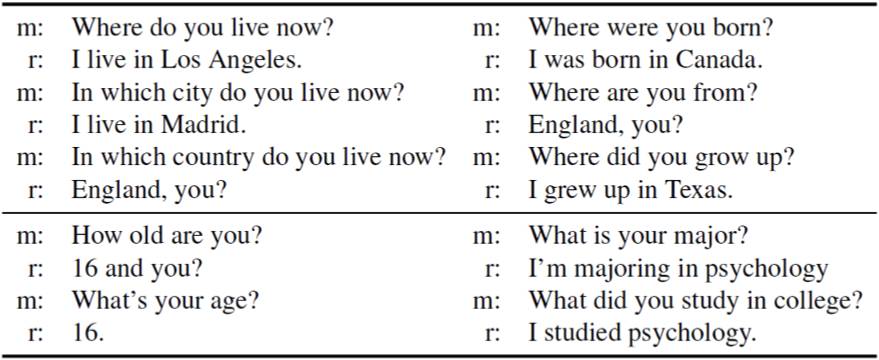 你也许会想到第 4 章节的个人角色模型,它基于先前生成的对话构建说话者信息/人物简介。但是只使用数百或数千的对话表明,仅仅通过用户发表在推特上的内容还不足以了解他们。(2) 一个特定语境对其中对话的暗示需要大量的先验常识。当人类对话时,这些常识很少被提及或描述,因为对话参与者认为这是理所当然。这意味着即使我们有了关于对话的具体语境信息,也无法清楚知道为什么该对话会发生在该语境中,因为说话者忽略掉了大量常识信息。这对基于模仿的机器学习系统(比如 SEQ2SEQ 模型)带来了巨大挑战,因为这样的模型只是通过训练集一味模仿而不知其原因并不是理解人类交流的最优路径。