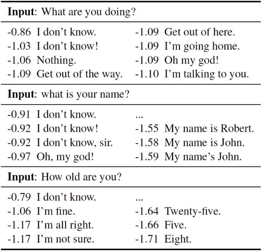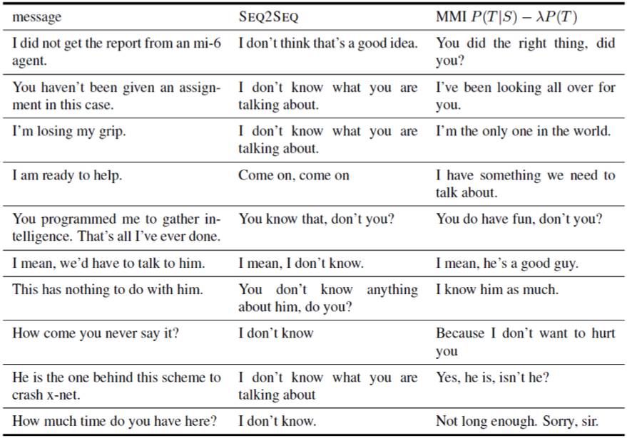 当我们将 SEQ2SEQ 模型应用与生成回复的时候,一个严重的问题脱颖而出:神经对话模型总是会倾向于生成无意义的回复,例如「I don't know」、「I don't know what you are talking about」(Serban et al., 2015;Vinyals & Le, 2015)。从表 3.1 中我们可以看出,很多排名靠前的回复是泛化的。那些看起来更加有意义、更有针对性的回复可以在非最佳列表中找到,但是排名非常靠后。这种现象是因为通用性回复如 I don't know 在对话数据集中相对较高的频率。MLE(最大似然估计)目标函数对源到目标的单向依赖性进行了建模,由于无意义回复没有意义,有意义回复多种多样,系统总会倾向于生成这些无意义的回复。直观上,似乎不仅要考虑回复与信息的相关性,也需要考虑传递的信息是否具有意义:如果回答是「I don't know」,我们就难以猜测对话者开始询问的是什么。