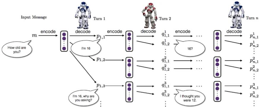 模拟两个机器人轮流对话的过程是这样的,在一开始,从训练集中随意找到一句话作为输入给第一个机器人,这个代理通过编码器网络把这个输入编码成一个隐层向量,然后解码器来生成回答。之后,第二个机器人把之前那个机器人输出的响应和对话历史结合起来,重新通过编码器网络编码得到一个隐层向量(相当于更新了对话的状态),然后通过解码器网络生成一个新的回复,并传给第一个机器人。这个过程不断被重复下去: