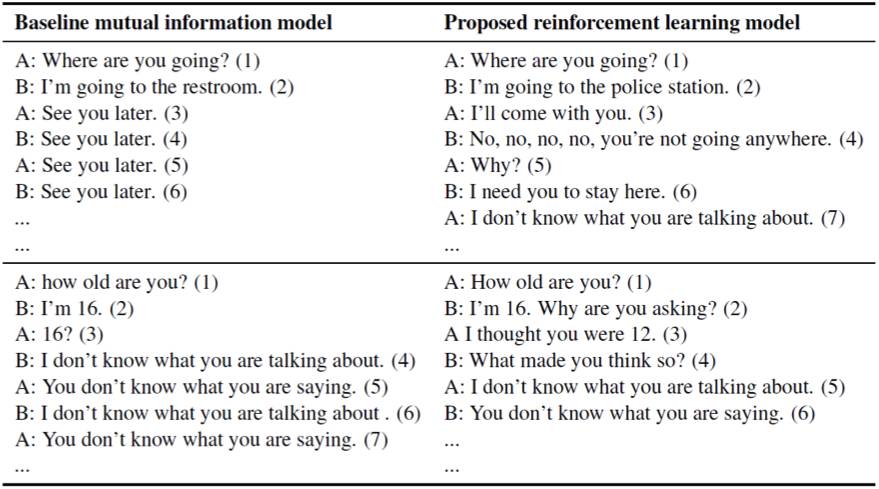 表 5.1:左列:使用 SEQ2SEQ 模型和 OpenSubtitles 数据集训练的两个智能体之间的对话模拟。第一轮(指标 1)是由作者输入的,然后两个智能体轮流应答,一个智能体的输入将作为另一个的在前生成轮。右列:使用我们提出的强化学习模型的对话模拟。新的模型拥有更具前瞻性的言辞(诸如「你为什么要问这个问题」、「我和你一起去」),在掉入对话黑洞之前能进行更持久的对话。