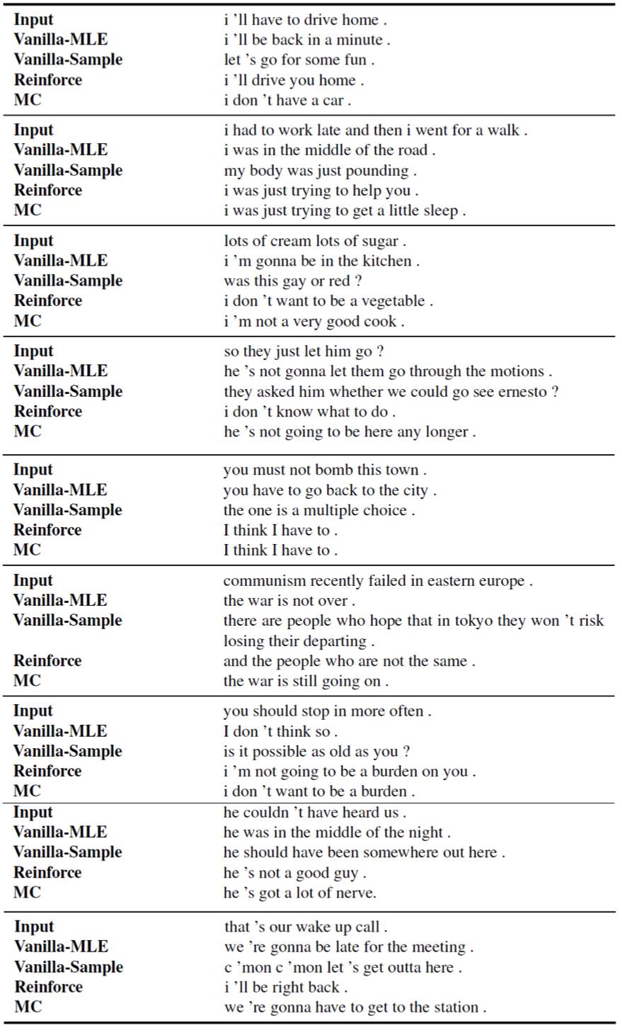 实验结果(表 5.1 中右侧的样本结果)表明我们的方法产生了更持久的对话,并且相比使用 MLE 目标训练的标准 SEQ2SEQ 模型,能生成更具交互性的应答。