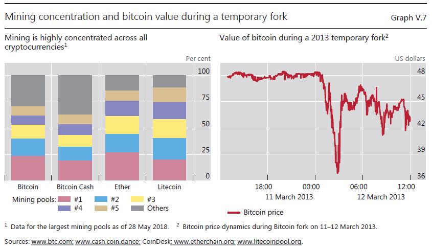 2013年3月11日,一次错误的软件更新导致了区块链出现分叉,消息传开后,比特币的价格就下跌了近三分之一。最后,经过协调,矿工们暂时忽略了最长的链条,最终暂停了分叉,但许多交易被撤销了。BIS也认为这个插曲显示了加密货币是多么容易分裂,从而导致巨大的估值损失。