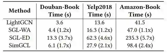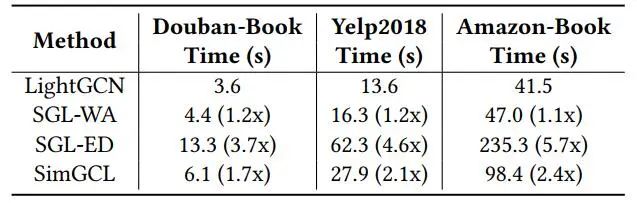 由于省去了图增强,SimGCL所需时间远少于SGL。