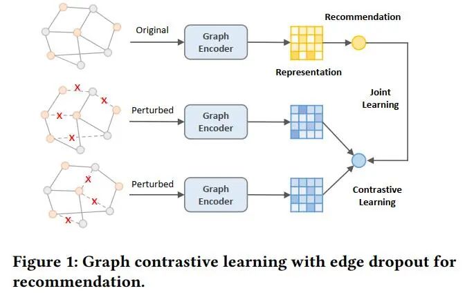 对比学习作为当下的热点技术被广泛用于推荐系统以缓解数据稀疏问题。一种典型的对比学习流程为:首先对原始的用户-商品二部图进行结构扰动(以一定概率随机丢弃节点/边)以获得图增强 (graph augmentation),然后训练图模型最大化不同graph augmentations之间的互信息,以此提升模型的泛化能力(见图1)。尽管这种基于dropout的对比学习范式被证明是有效的,但其有效的原因尚不明确。直觉上,我们认为通过对比不同的graph augmentations,模型可以提炼原始图的本质信息。然而,一系列最近的工作发现,即便非常稀疏的graph augmentations仍然能为模型带来不错的性能提升。这一现象非常出乎意料,因为一个高度稀疏的graph augmentation与原始图的语义已经相去甚远。由此引出一个问题,对于基于对比学习的推荐模型来说,graph augmentations真的是不可或缺的吗?