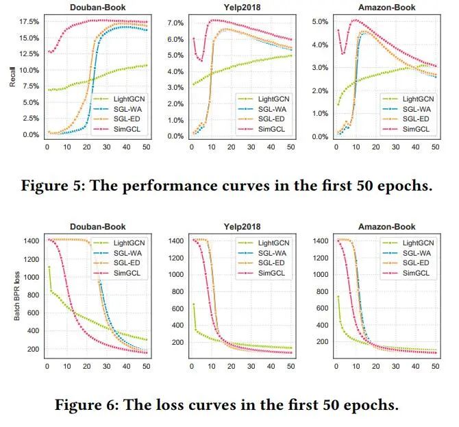 然后作者做了收敛性对比实验,由下图可知,SimGCL只需SGL所需的2/3迭代次数即可收敛,LightGCN收敛速度较慢。