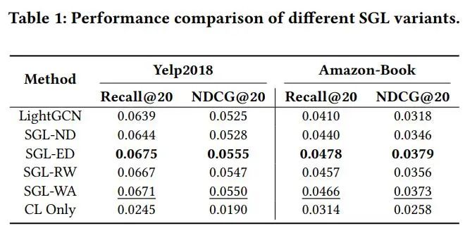 首先是与SGL变体在三个数据集上的的性能全面比较,训练主要参数均保持一致。详细设置见论文。
