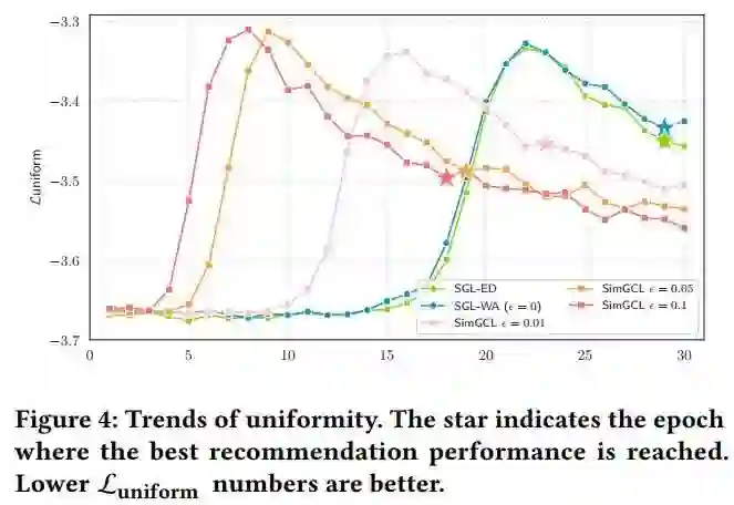 在图4中,可以看出,在最后收敛时,SimGCL学习到的表征均匀性高于SGL的两个变体,并且越大的噪声半径带来了越高的均匀性。