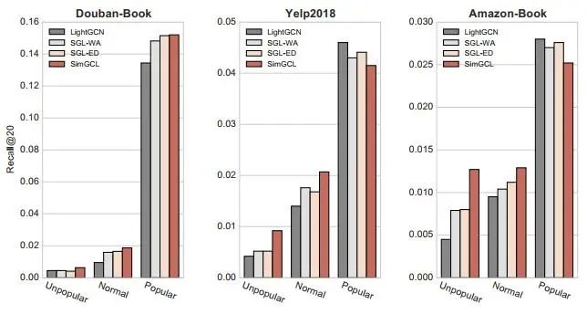 为了证明对比学习的去偏作用,作者将所有项目划分为三组:非流行项目(交互数排名后80%),流行项目(交互数排名前5%),普通项目(交互数居中),并做了在各组项目上的召回实验。各组结果之和为总的召回率。