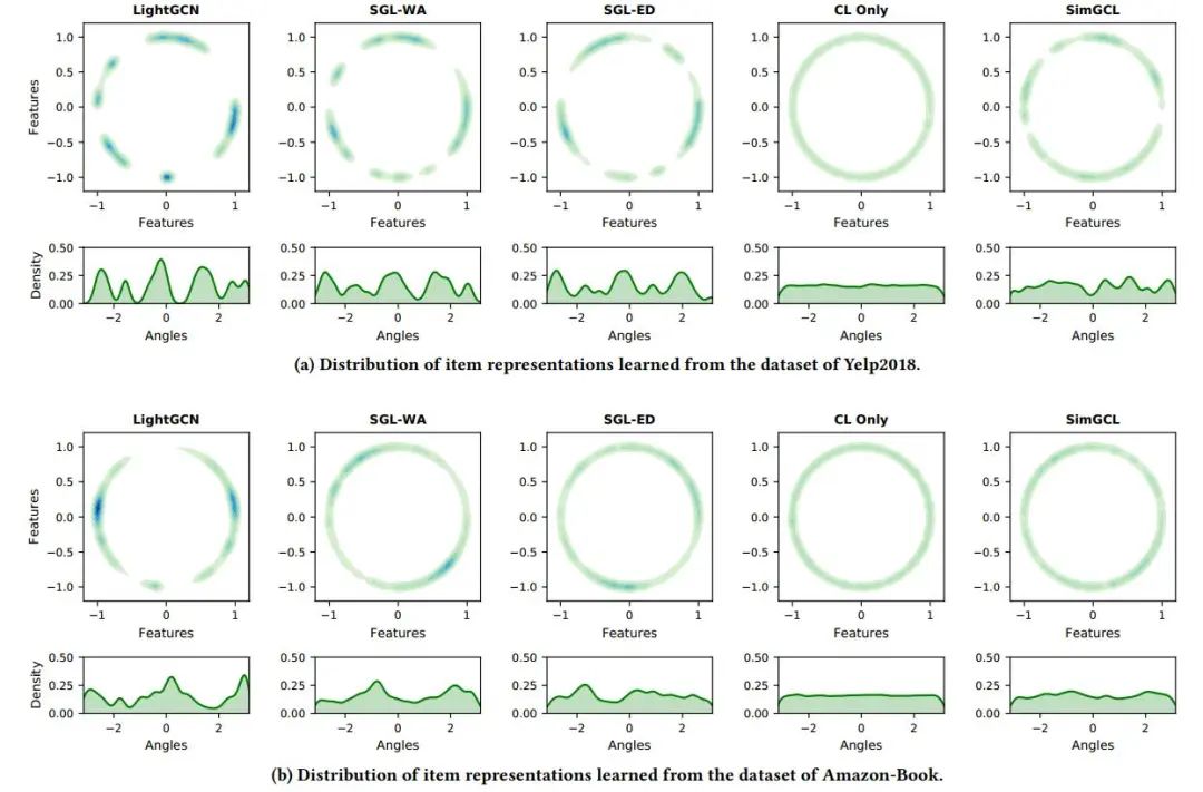 根据上图所示,SimGCL具有极强的去偏效应,其性能提升主要来自于非流行和普通项目,在流行项目上,其推荐效果反而降低了。考虑到用户往往能通过多种渠道可以获取流行项目信息,一个更善于推荐长尾项目的推荐方法更符合用户的实际需要。相比SimGCL, SGL也具有一定去偏能力,而LightGCN更善于推荐流行项目,容易导致推荐结果多样性和新颖性较差。