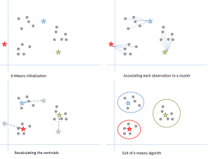 K-means是一个迭代算法,将类似的数据分组成簇。它计算k个簇的质心,并将一个数据点分配给具有最小距离的质心与数据点之间的数据点。