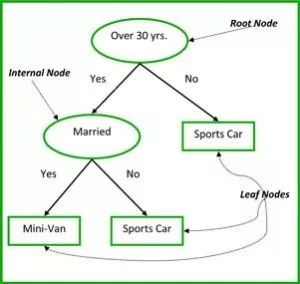 图3中的决策树根据年龄和婚姻状况分类是否会购买跑车或小型货车。如果这个人已经超过30岁,没有结婚,我们就像下面这样沿着树走:“30多岁吗?”- >是->结婚了吗?最后,该模型输出结果是一辆跑车。