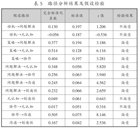 本研究的研究结果表明,深度学习策略、元认知能力、团队协作能力,对创造性思维能力无显著影响,而团队协作能力会影响沟通能力,沟通能力显著正向影响创造性思维能力。也就是说,相对于个体采用的深度学习策略、个体的元认知能力来说,沟通能力更能够影响整个创造力群体的内聚程度,从而影响个体的创造性思维能力。团队协作也为群体间的沟通交流提供了情境支持,它直接影响个体沟通能力的发展,从而进一步影响个体创造性思维能力的发展。该研究结论同时也要求研究者,对学习的社会化及创造性思维的培养之间的内在关系,需作进一步审视。