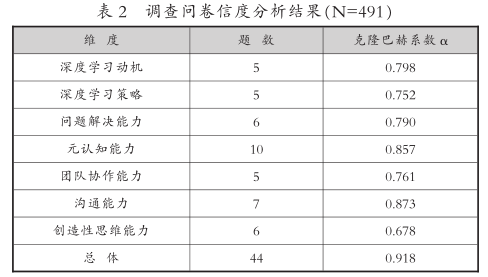 本研究运用SPSS 17.0对491份问卷中相应的数据进行信度分析,以克隆巴赫a系数来表征问卷题目的内部一致性。分析结果如表2所示。