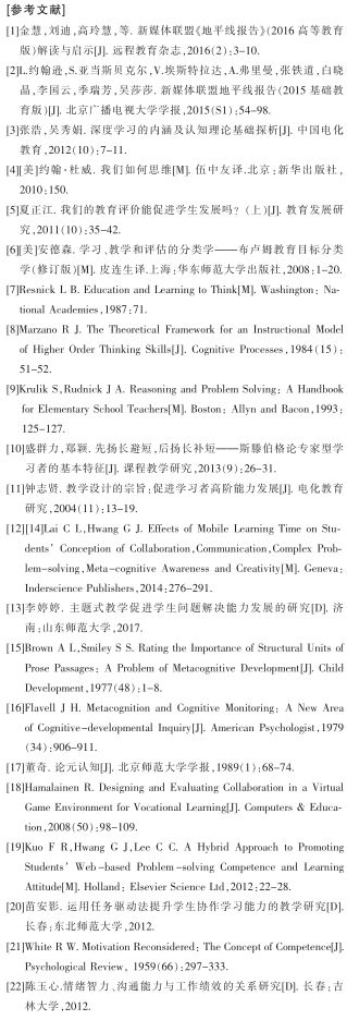 问题解决能力与批判性思维能力都要求学习者在面临一个复杂任务时,运用批判性思维规划与指导任务完成过程,如,理解任务目标、寻找相关信息、组织学习材料、推理结论、最终解决问题,并进行反思,从而提升高阶思维。元认知能力是批判性思维能力的基础。问题解决能力与批判性思维能力,是当下教育者与政府公认的学校教育所必须增强的能力;协作与沟通能力要求学习者在进行小组协作学习活动时,尊重同伴、与同伴进行有效的交流互动、通过自我调节贡献自己的努力,最终完成共同的任务目标。协作与沟通能力不仅可以发展学习者自身的高阶思维:还可以帮助学习者理解同伴的文化背景,扩大他们的国际视野。创造性思维能力要求学习者在创造性活动中详细阐述、分析和评价他们的观点,以开放的心态吸纳他人的想法,并反馈到自己与小组的学习过程中,在不同思维的碰撞中达到创造,以适应新时代对创造性思维能力的更高要求。