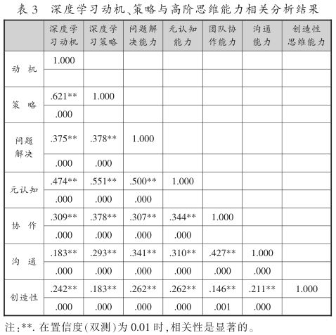 本研究利用491份问卷数据,运用SPSS 17.0对深度学习动机、策略与高阶思维能力(问题解决能力、元认知能力、团队协作能力、沟通能力、创造性思维能力)做相关分析。由于采用李克特五点量表收集数据,以1-5的等级形式表示数据,因此,本研究选择斯皮尔曼等级相关分析方法。相关系数取值范围与相关程度的对应为:相关系数在0.8-1.0之间,两个变量属于极强相关:相关系数在0.6-0.8之间,两个变量属于强相关'相关系数在0.4-0.6之间,两个变量属于中等程度相关:相关系数在0.2-0.4之间,两个变量属于弱相关:相关系数在0.0-0.2之间,两个变量属于极弱相关或无相关。相关关系结果,如表3所示。