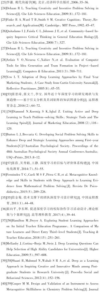 L.T.Yew探讨了教学策略的改变对学生学习方式的影响。该研究采取行动研究方法,通过问卷调查、访谈、个人日记记录等形式,对32名市场营销专业的学生进行了数据收集。结果表明,当改变学习环境与教学策略之后,例如引入小组作业和问题解决练习,学生对深度学习方法的运用得到了普遍的提升[29]。Helen Barrett提出了基于数字叙述技术(Digital Storytelling)的学习模式,他运用实验法探究了技术支持下深度学习模式的应用效果。该研究发现,数字叙述支持的故事项目能够促进学习者对课程内容的深度理解,同时,学习者的问题解决能力也得到了一定的提升[30]。Nina Diamond等开发了一门基于深度学习机制的市场营销课程,以探究多种知识工具支持下的课程效果。结果表明,学生的问题解决能力得以提升[31]。Burton等调查研究了澳大利亚一所大学中,128名一年级学生的问题解决与深度学习之间的关系。结果表明,高问题解决能力与深度学习呈正相关:低问题解决能力与浅层学习呈正相关[32]。