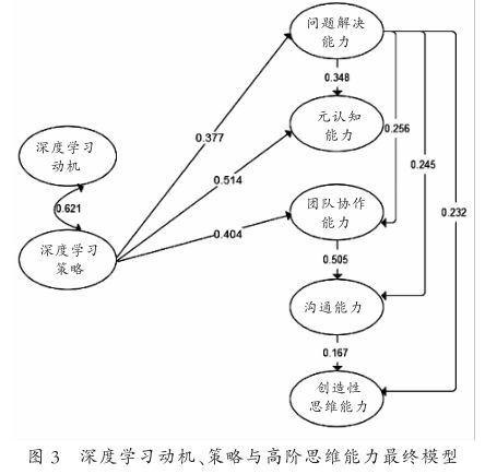 根据上述分析结果,本研究对深度学习动机、策略与高阶思维能力因果关系模型进行了修正,最终确定的模型,如图3所示。该模型结果显示,从深度学习的角度看,深度学习动机与深度学习策略呈显著正相关关系;从深度学习与高阶思维能力关系的角度看,深度学习动机对高阶思维能力无显著影响,深度学习策略显著正向影响问题解决能力、元认知能力、团队协作能力,而对创造性思维能力无显著影响:从高阶思维子能力间关系的角度看,问题解决能力显著正向影响元认知能力、团队协作能力、沟通能力、创造性思维能力,团队协作能力显著正向影响沟通能力,沟通能力显著正向影响创造性思维能力。而元认知能力对创造性思维能力无显著影响,团队协作能力对元认知能力、创造性思维能力均无显著影响。