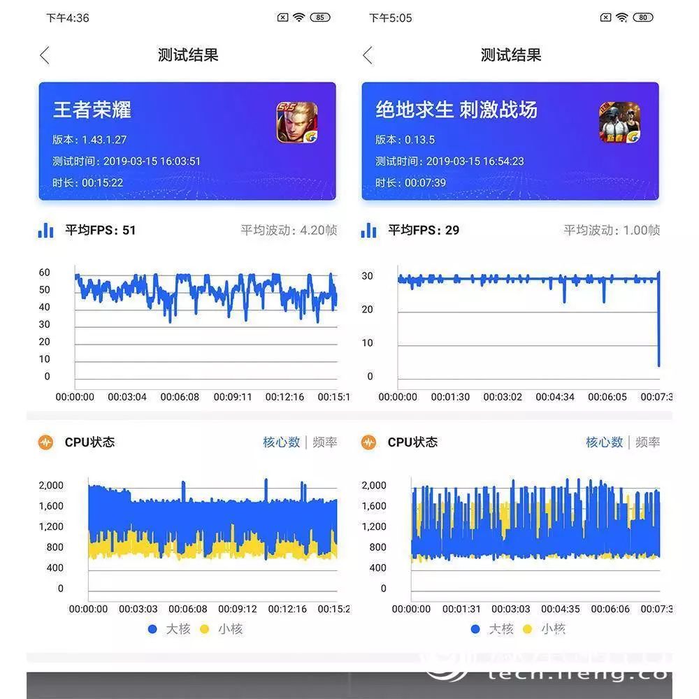 我们选取市面上两款主流手机游戏《王者荣耀》和《绝地求生:刺激战场》,将画面特效全开并实时记录帧率,值得注意的是,在骁龙675处理器下,绝地求生满帧即为30帧。测试结果显示王者荣耀平均帧率51,帧率波动4.2,绝地求生平均帧率29,帧率波动1;王者荣耀优化的并不是特别顺畅,期待后期OTA会有对应优化,绝地求生处于正常表现水平。