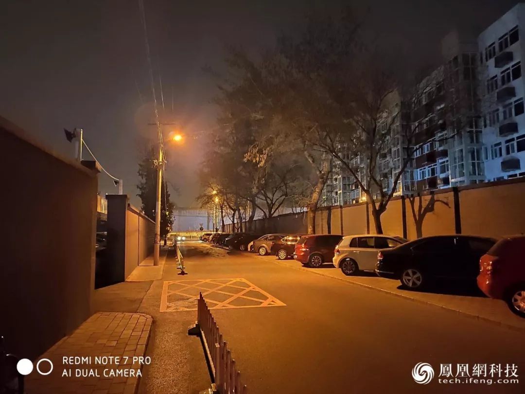夜晚暗光情况下,AI相机会智能识别夜晚模式,增加画面亮度,成像时速度很快,对焦也没有拖沓感,但成片亮度仍较低,对高光的抑制也不理想,但好在Redmi Note 7 Pro支持手持超级夜景模式。