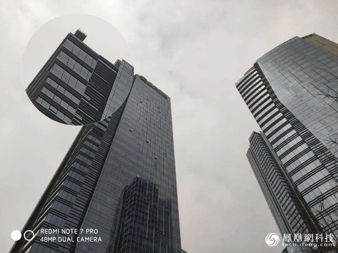 IMX586相比GM1最大的不同就是支持4800万像素直出,我们手动强制打开4800万模式,从这张大楼的照骗可以看到,放大一倍之后,远处楼顶的窗户纹理细节依旧清晰,放大后也没有出现锯齿,还是比较不错。