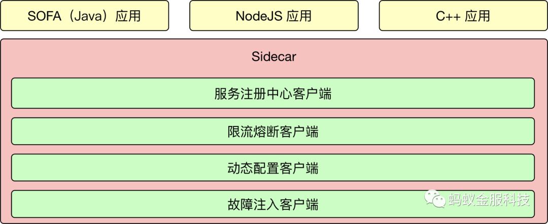 以上的这些中间件都是基于 Java 技术栈的,目前 SOFA 在蚂蚁金服内部大概超过 90% 的系统在使用,除了这些系统之外,还有剩下的 10% 的系统,采用 NodeJS,C++,Python 等等技术栈研发的。这剩下的 10% 的系统想要融入到 SOFA 的整个体系中,一种办法是用对应的语言再去写一遍 SOFA 中间件的各个部分对应的客户端。