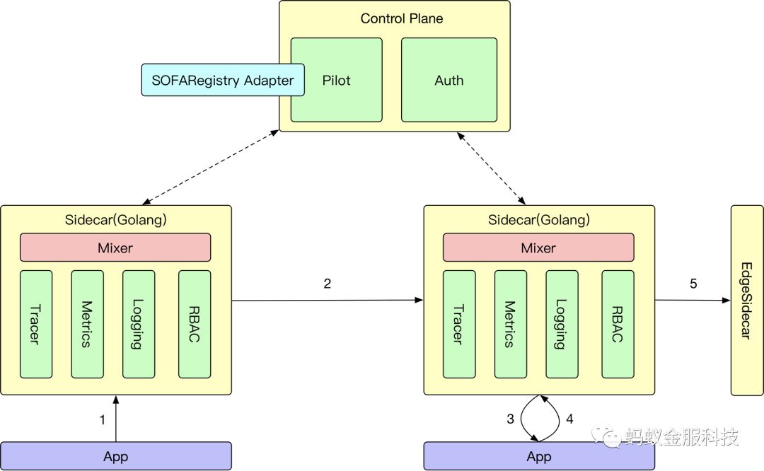 所以,SOFA Mesh 在整体的大图上大概是这样的,我们自研了一个 Golang 的Sidecar,并且把 Mixer 纳入到 Sidecar 中,来防止出现类似于 Istio 那样的性能问题,在 Pilot 和 Auth 这两个角色了,我们选择直接使用Istio 的,然后在上面做一定程度的适配,适配到蚂蚁内部的环境中,然后我们在整个部署上,新增了一个 EdgeSidecar 的角色,来解决跨环境的服务调用的问题。