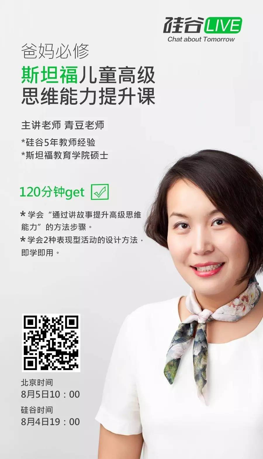 如何让孩子获得高级思维能力,本期硅谷Live,我们就邀请到了斯坦福大学毕业生,在硅谷有5年名校教学经验的青豆老师,来谈谈如何在讲故事的过程中培养孩子的“高级思维能力”。