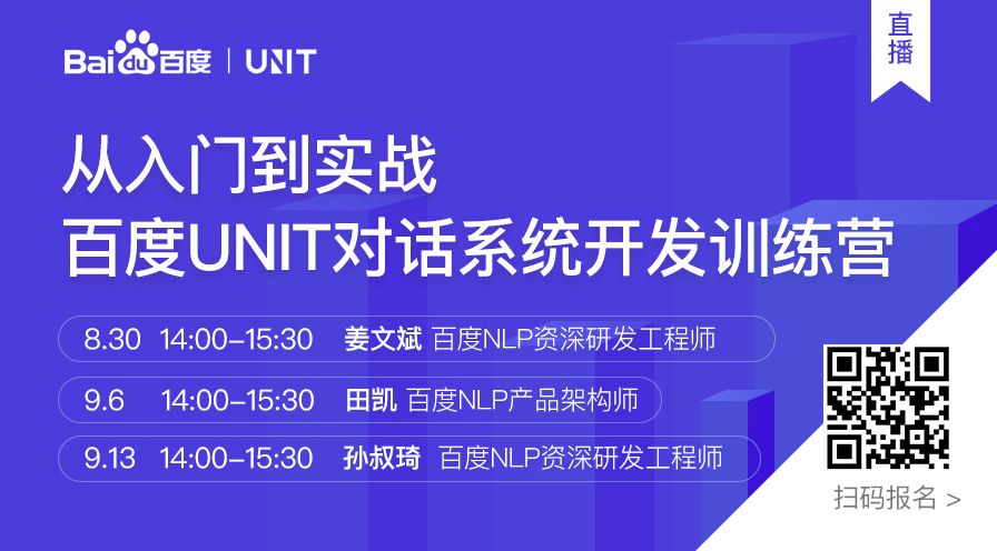 为了让更多开发者学习百度 UNIT 对话系统开发技能,8 月 30 日起每周四 14:00-15:30,InfoQ 与百度联合推出“ 从入门到实战 百度 UNIT 对话系统开发训练营”主题活动,将有百度的三位大咖级专家联合出席讲授三门线上课程,从 UNIT 对话系统的基本结构和功能入手,介绍 UNIT 核心模块和常用技术,以及 UNIT 平台底层机制,零起步零编程,教你快速完成对话系统的搭建和应用,掌握 UNIT 高级实用技巧,完成对话系统全套开发实践。