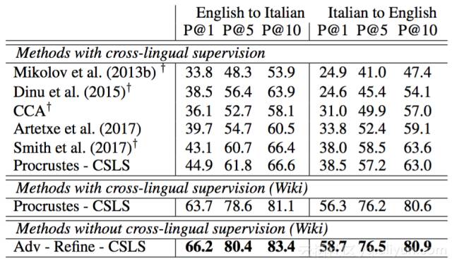 随着词嵌入的成功,跨语言词嵌入的想法也出现了,目标是对齐嵌入空间而不是词典。不幸的是,这种方法也依赖于双语词典或平行语料库。Conneau et al·(2018)提出了一个非常有前景的方法,不依赖于任何特定的资源,且对于多个语言对的次翻译、句子翻译检索和跨语言单词相似度任务上优于监督学习的方法。
