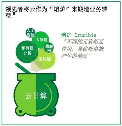 融合多种新兴技术和颠覆性技术(如物联网、移动、认知和预测性分析)之后,云熔炉的变革性力量会显著增强。这种融合有助于变革内部流程,创造新的业务模式,创新行业价值链或从根本上重塑客户关系,从而加速企业和行业转型。