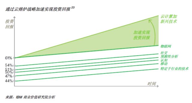 无论哪一项新技术,单独使用都能带来出色的投资回报。但当它们在云端互相融合时,才会迸发出真正的潜力。采用云计算的企业在财务和竞争优势方面的差异仅仅是停留在成本效率的层面,而实施云熔炉战略能够将竞争对手甩下一大截。将物联网、区块链、认知、移动和社交技术整合到云端,可以激励不断创新,创造并捕获新的市场,产生新的收入流,加速实现投资回报。