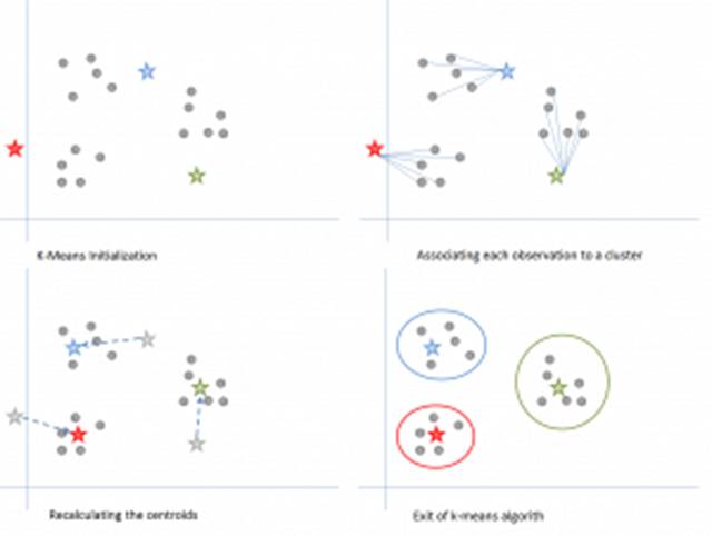K-均值是一个对相似的数据进行聚类的迭代算法。它计算出 k 个聚类的中心点,并给某个类的聚类分配一个与其中心点距离最近的数据点。